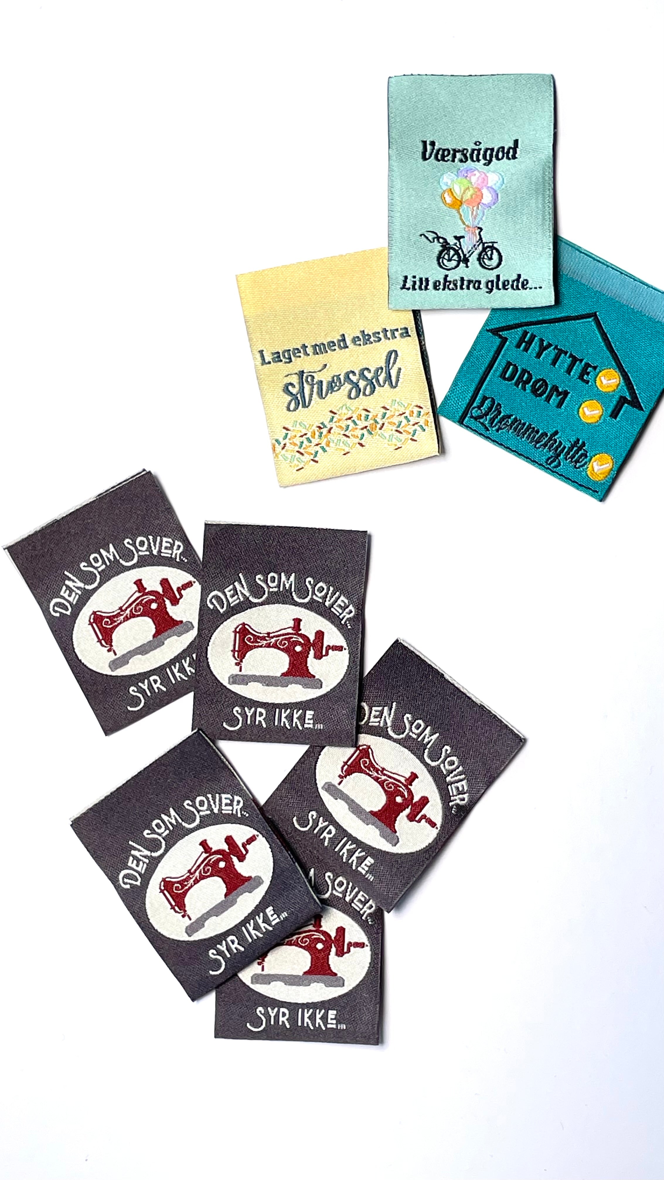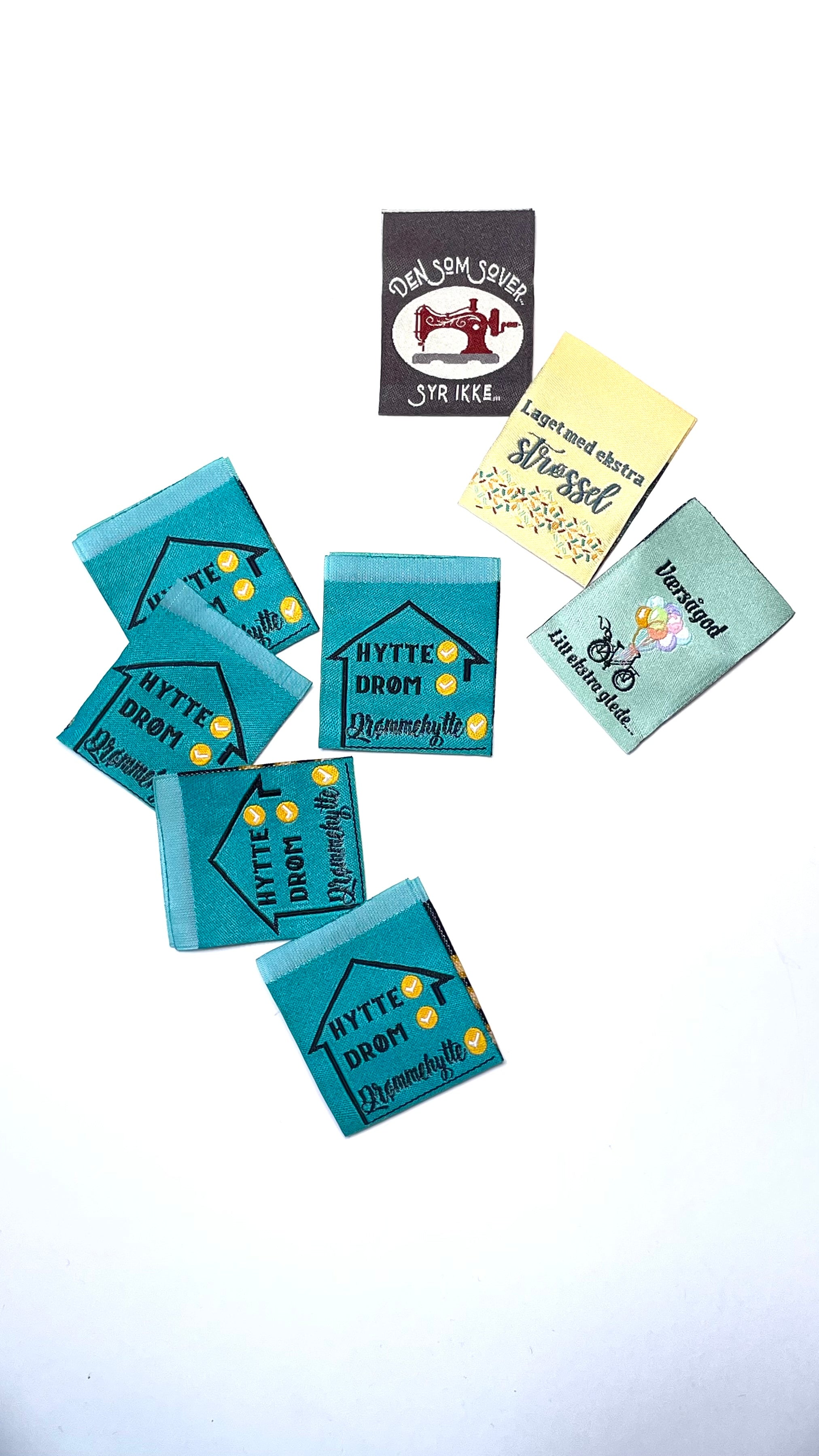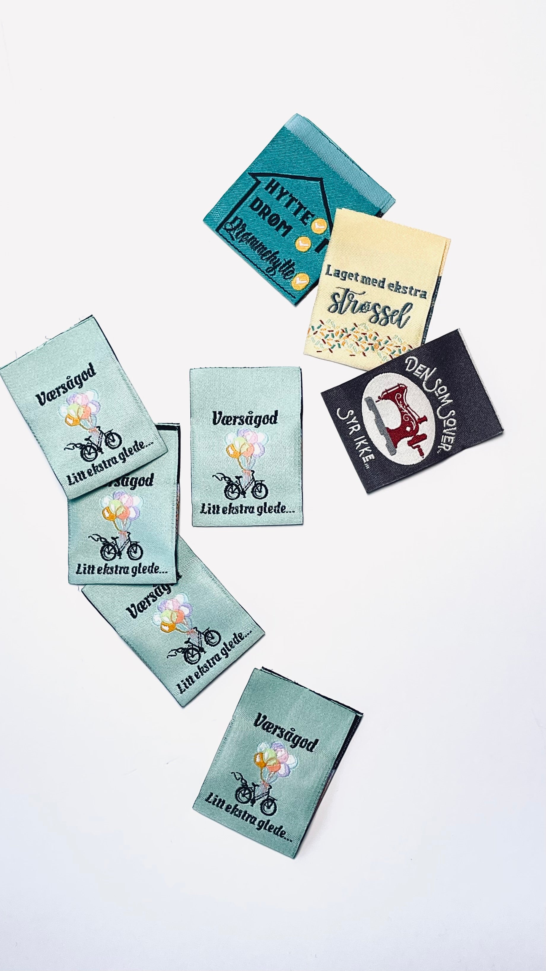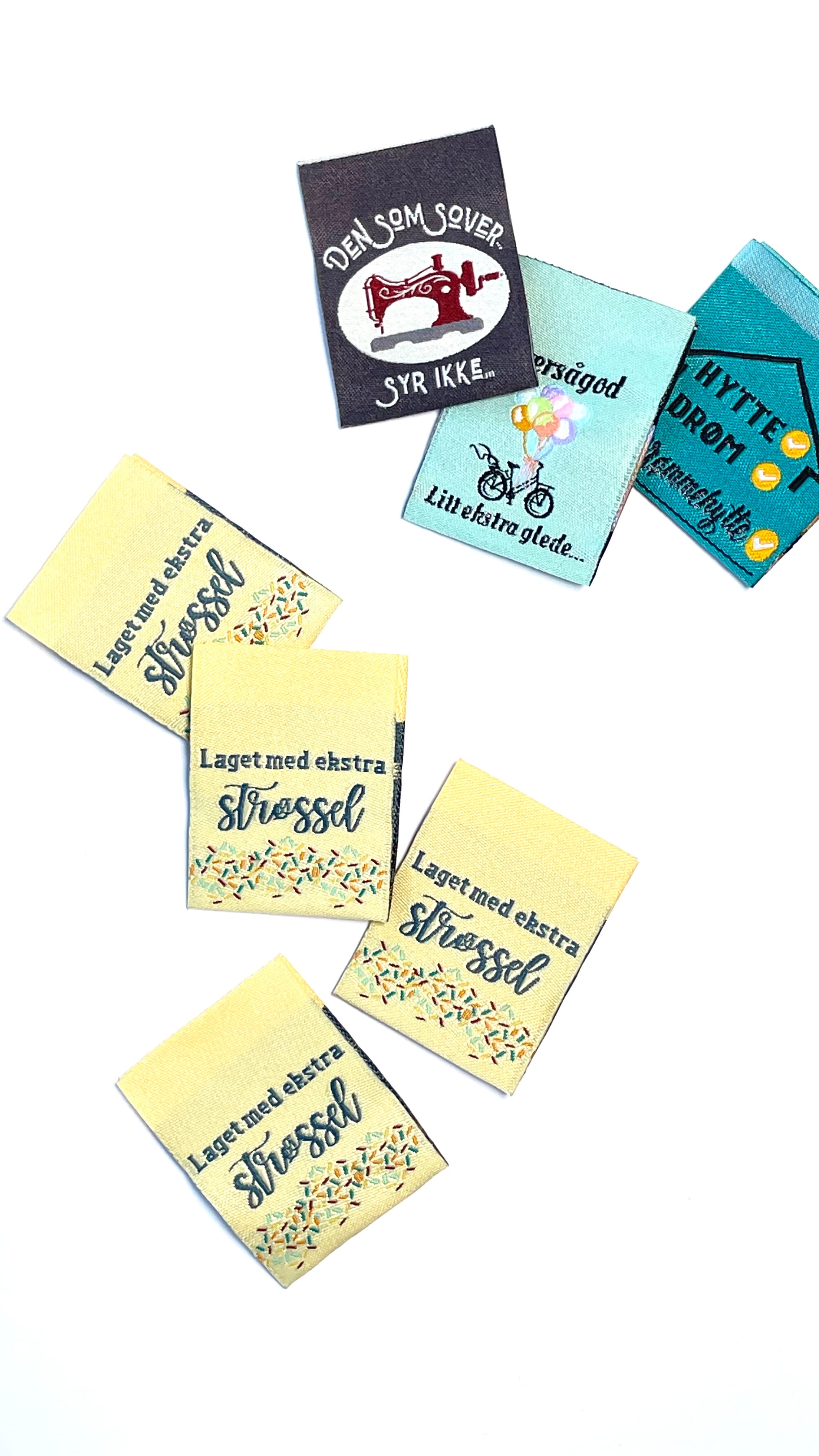 Pakken inneholder 4 ulike design, og både farger og tekst er laget av meg. Hver pakke består av 5 lapper av hvert design – tilsammen 20 merkelapper.